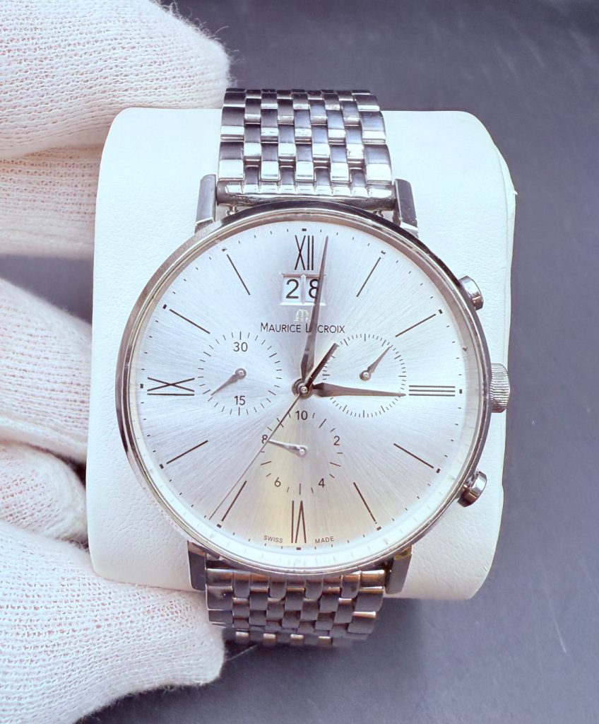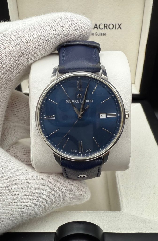 Zegarek Męski Maurice Lacroix Eliros Ref.EL1088 średnica 40mm szkło szafirowe. Sprzedawany jest sam zegarek, bransoleta ma wszystkie ogniwa i pasuje nawet na duży nadgarstek. Stan bdb minus za lekką ryskę na godzinie 11 jest ona praktycznie nie widoczna gołym okiem nie mówiąc już o sytuacji gdy zegarek znajduje się na nadgarstku