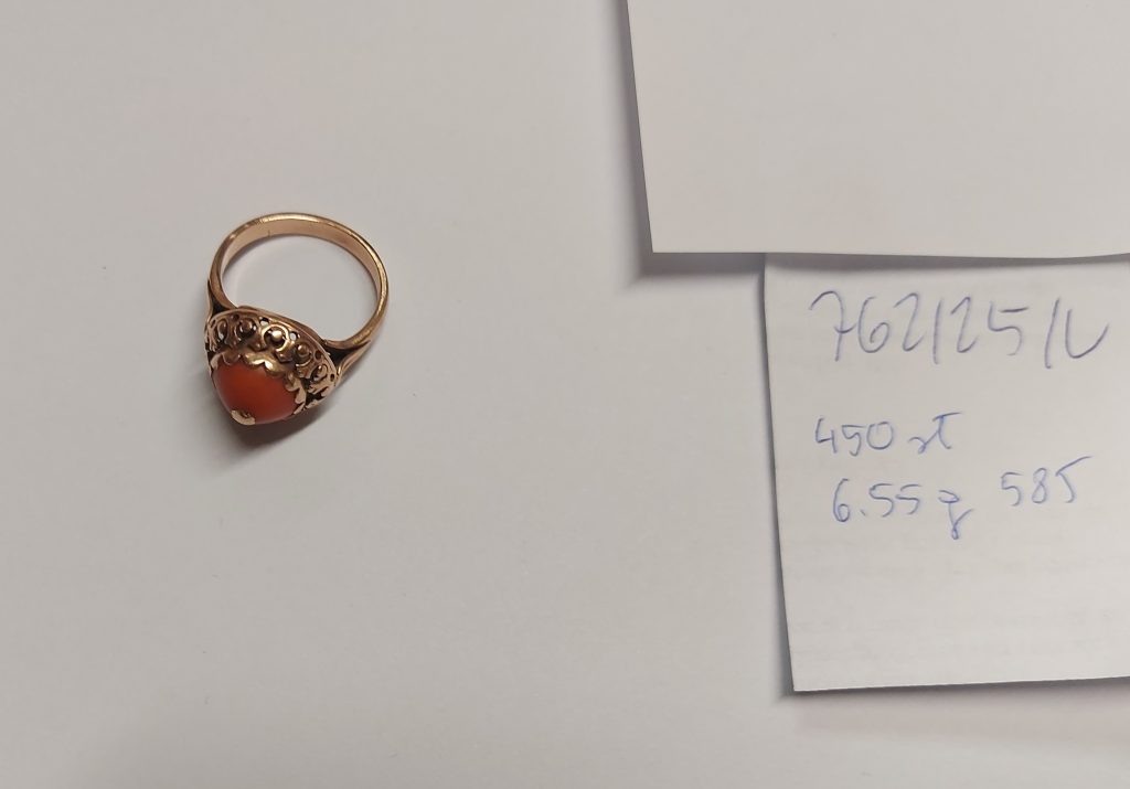 Złoty Pierścionek Koral pr. 585 ; waga 6,55g Stan: używany – dobry